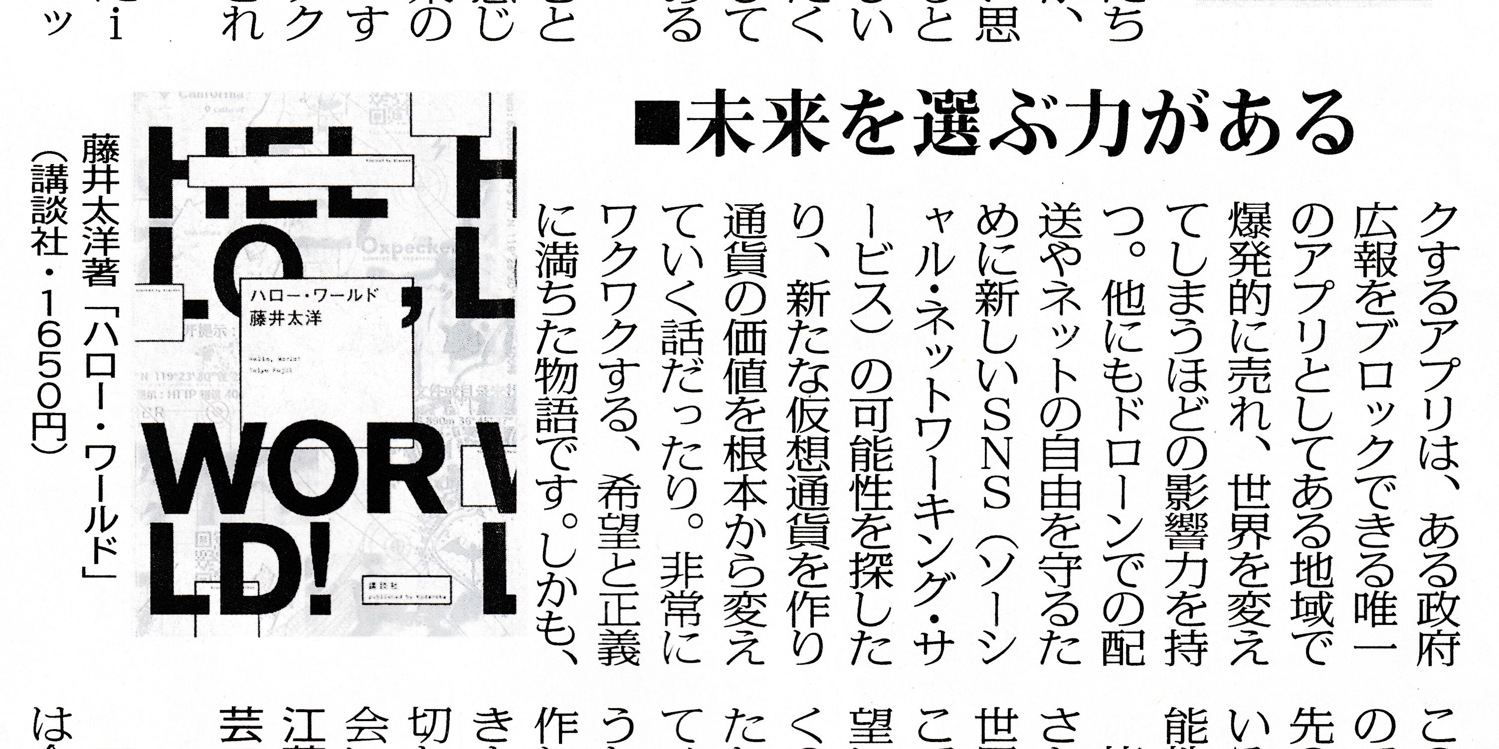 今回は9月7日に掲載された藤井太洋(著)のSF小説「ハローワールド」です。