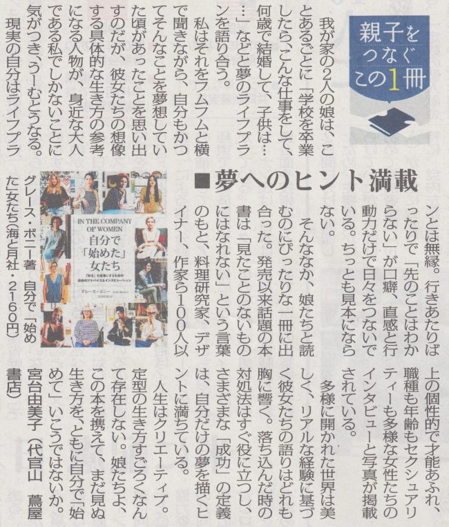 毎日新聞で毎月最初の月曜日の朝刊に掲載されている「親子をつなぐこの1冊」。 今月は。グレース・ボニー著 自分で「始めた」女たち のご案内です。 この本をご紹介いただいたのは宮台由美子さん。(代…