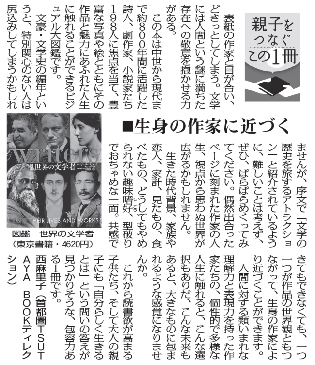 毎日新聞で毎月最初の月曜日の朝刊に掲載されている「親子をつなぐこの1冊」。 今月は「図鑑 世界の文学者」のご案内です。 「図鑑・・・?」 ちょっと気になるタイトルですよね。 この本は、中世から現代まで約80…