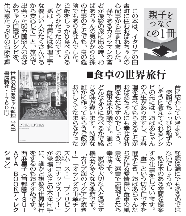 毎日新聞で毎月最初の月曜日の朝刊に掲載されている「親子をつなぐこの1冊」。 今月は「世界のおばあちゃん料理」というタイトルの1冊をご案内です。 この本は、50カ国を旅して出会ったおばあさんたちから 自慢のレシピの数々…