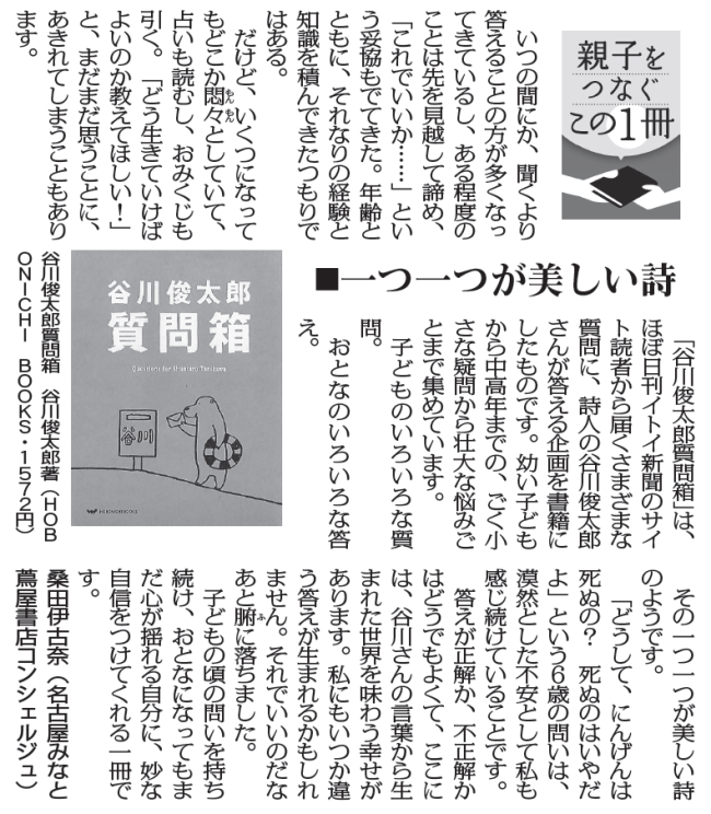 毎日新聞で毎月最初の月曜日の朝刊に掲載されている「親子をつなぐこの1冊」。 お久しぶりの投稿になってすみません。 せっかく「おうち時間」を過ごしていらっしゃることが多くなった皆様に 今回、2ヶ月分連続のご紹介です。その第…