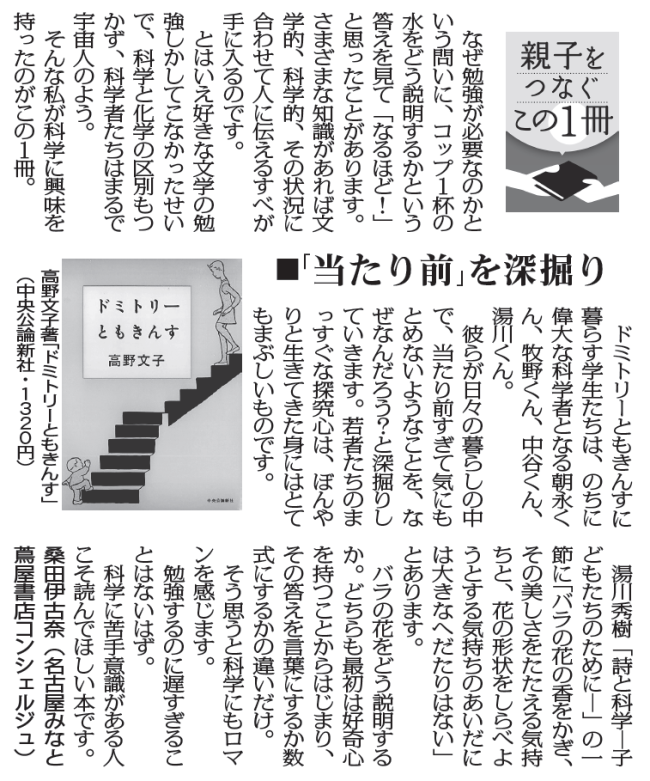 毎日新聞で毎月最初の月曜日の朝刊に掲載されている「親子をつなぐこの1冊」。 2ヶ月分連続のご紹介となる第2弾は、今回、連休後の5月18日に掲載された 高野文子著「ドミトリーともきんす」。 こちらは不思議な学…