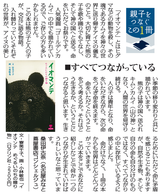 毎日新聞で毎月最初の月曜日の朝刊に掲載されている 「親子をつなぐこの1冊」 今回は6月1日の毎日新聞に掲載された 寮 美千子 文、小林敏也 画 の「イオマンテ めぐるいのちの贈り物」です。 「めぐるいのち」の物語は、動物…
