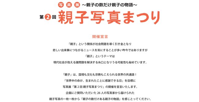 「親子の日」公式イベントが本日スタートいたしました。 「エッセイコンテスト」「写真コンテスト」「親子大賞」の3つの公式イベントとともに、今年は、プロの写真家26人(10ヶ国)が撮影した親子写真を展示する「親子写真まつり」…