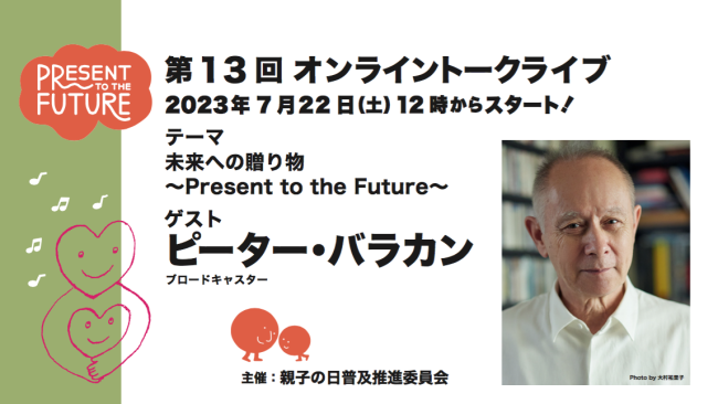 2023年7月22日(土)12時からスタート https://oyako.org/talk/ テーマ:「未来への贈り物~Present to the Future~」 ゲスト:ピーター・バラカン 第13回目のオンライ…