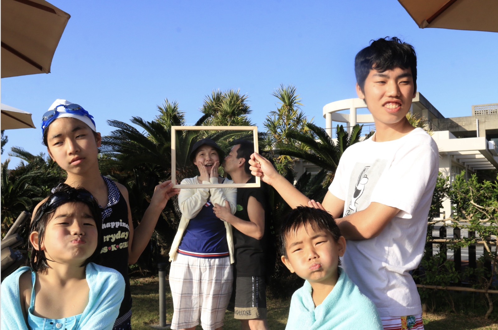 家族写真が撮りたかったので、セルフィートライ「みんな足上げてる感じで!」と言ったらそれぞれ足の上げ方が違って 面白い写真になった。