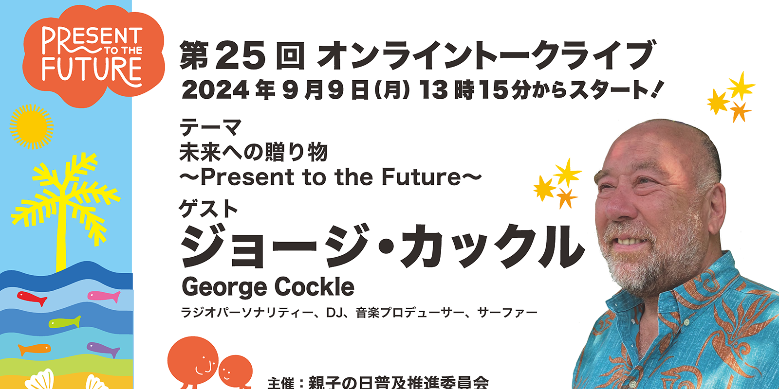 第25回目のオンライントークライブのゲストは、ラジオパーソナリティー、DJ、音楽プロデューサー、サーファー他、幅広い分野で活躍中のジョージ・カックル (George Cockle) さんです。進行は、編集者でプロデューサーの関智が担当。写真家のブルース・オズボーンと、親子の日普及推進委員会代表の井上佳子も登壇いたします。
