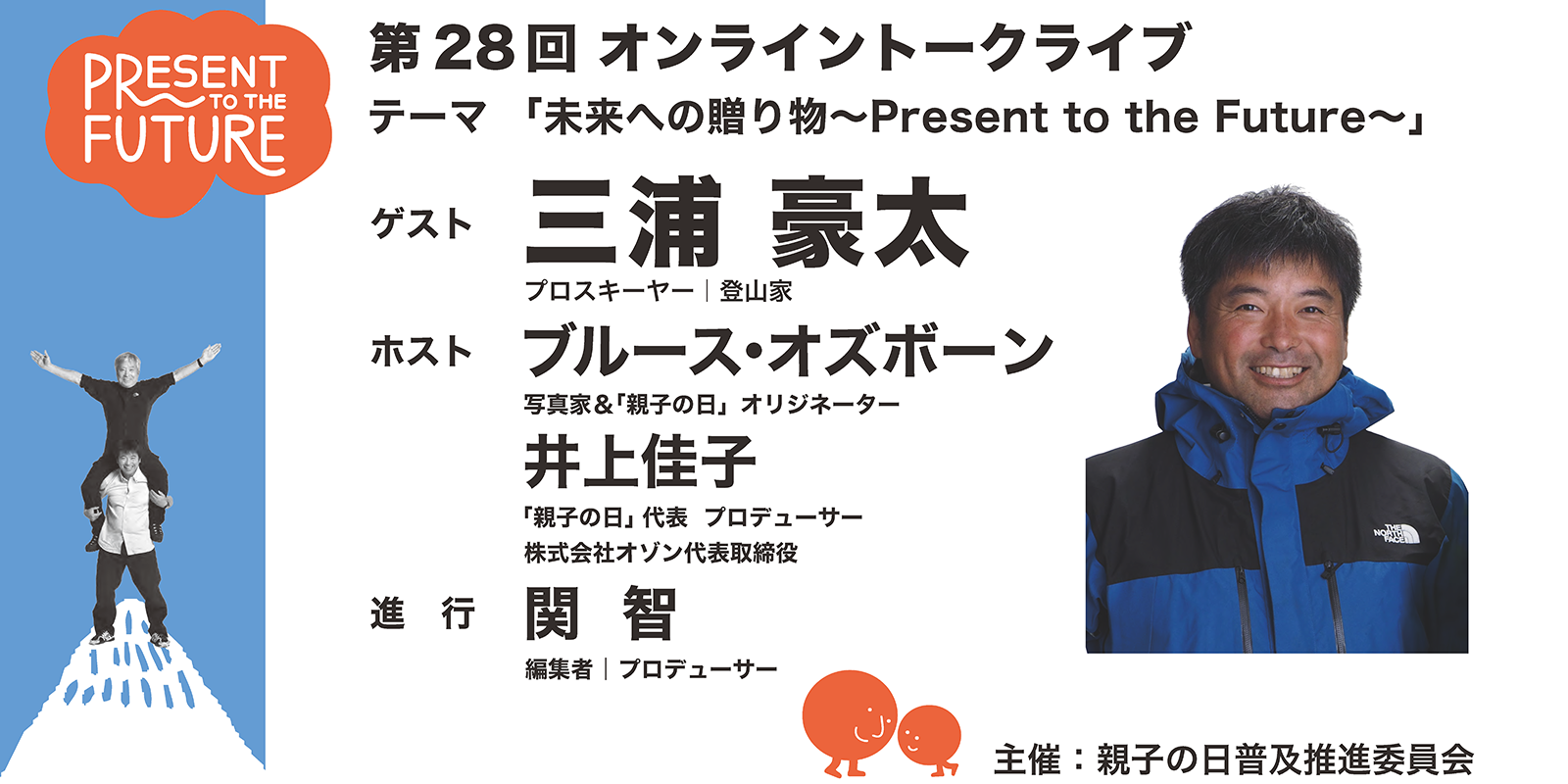 第28回目のオンライントークライブのゲストは、プロスキーヤーの三浦雄一郎氏を父親に持ち、100歳になっても世界でスキーを滑っていたという三浦敬三を祖父に持つ三浦豪太さんです。2003年、父、雄一郎氏とともに世界最高峰エベレスト山(8848m)登頂し、初の日本人親子同時登頂記録を達成。2008年5月、2回目の親子登頂中、高地脳浮腫の症状が見られたため下山。その後も父のかたわらで挑戦を続け、2013年に2度目の親子登頂が実現。2019年1月に南米最高峰アコンカグア登頂を成し遂げました。親子でチャレンジした貴重な経験などのお話を聞かせていただきます。進行は、編集者でプロデューサーの関智が担当。写真家のブルース・オズボーンと、親子の日普及推進委員会代表の井上佳子も登壇いたします。