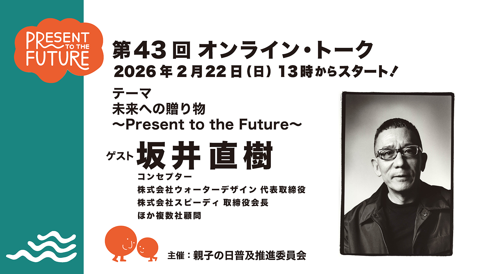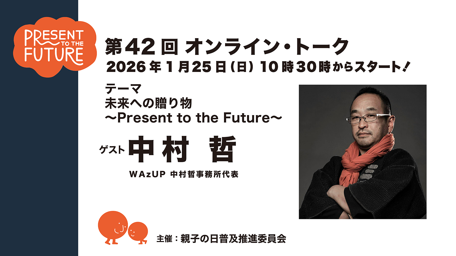 2026年最初の「親子の日」オンライン・トークは、「我孫子の親子の日」を通じて、また多くの側面から私たち「親子の日」をサポートしてくださっている中村 哲さんをお迎えし、「親子の日2026年」への抱負を熱く語っていただきます。進行は、編集者・プロデューサーであり、親子の日普及推進委員の 関 智。写真家の ブルース・オズボーンと、親子の日普及推進委員会代表の井上佳子も参加します。